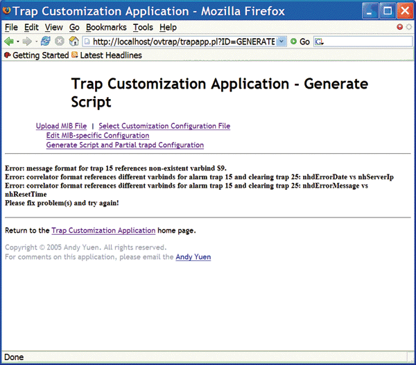 Script generation error message page