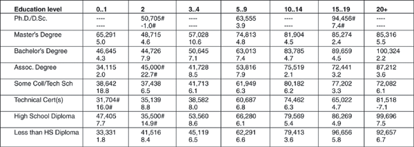 Salary and increase by education/experience (yrs.)