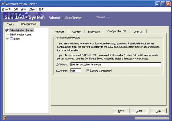 Administration server configuration screen