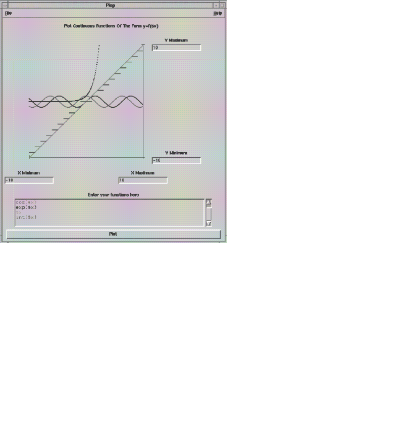 The Perl/Tk application that I am going to develop is called Plot Program, or plop for short, featuring Button, Canvas, Dialog, Frame, Label, LabEntry, Menu, Menubutton, Scrollbar and Text widgets. Plop plots a list of mathematical functions of the form y = f($x), where $x iterates from the graph's X-minimum to X-maximum. Each function is evaluated in turn for a particular value of $x; the y value is then computed and a point is painted on the canvas. (Plop emphasizes the canvas widget because I've noticed that new Tk users, after watching around 2000 lines of canvas documentation roll by, tend to place "exploring the canvas widget" at the end of their to-do list! But I think you'll find that feature-rich does not mean difficult to use.)