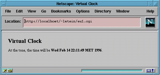 #!/usr/bin/perl print "Content-type: text/html\r\n"; print "\r\n"; chomp($time = 'date'); print<<EOF; <HTML><HEAD> <TITLE>Virtual Clock</TITLE> </HEAD> <BODY> <H1>Virtual Clock</H1> At the tone, the time will be <STRONG>$time</STRONG>. </BODY></HTML> EOF