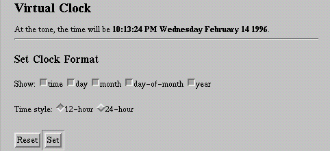 Using CGI.pm, we can enhance the simple virtual clock script to allow the remote user some control over the time format. This script allows the user to control whether the time, day, month, and year are displayed, and toggle between displaying the time in 12-hour or 24-hour format.