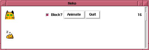 It's possible to animate neko using a blocking or non-blocking technique, depending on the state of the Block? checkbutton. Try each alternative and note how the buttons respond as you pass the cursor over them. $DELTA_X controls how "fast" neko runs, and is tied to the slender scale widget to the right of the window. Varying its value by moving the slider makes neko either moonwalk or travel at relativistic speeds!