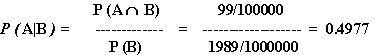 Really, what we want to know is P(A|B), the probability that a person has backslashitis given that their test result is positive. That's what will help us decide whether to recommend that they pack up their things and head to Edmonton. If P(A|B) is very nearly 1, then it is almost certain that the person has the disease and should be sent to Edmonton for treatment. Since our test is so good, what with P(B|A) = 99/100 and all, we would expect P(A|B) to be equally good... wouldn't we?