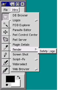 For example, if you select the "Xtns" (extensions) menu from the toolbox window and then select the "Render" sub-menu, you will see an "SNS Logo" entry if and only if you have installed the example code from below in your .gimp/plug-ins directory. It will appear as shown in Figure 2.