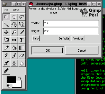 Well, times have changed, but I'm still doing company logos for projects that I'm working on. Now I have a new tool in my belt: the Gimp (www.gimp.org). The Gimp is a powerful, Photoshop-like image manipulation program with a plug-in interface. Unlike Photoshop, this plug-in interface is self-documenting and extensible. Also, the Gimp allows programmers complete control from their favorite language. Mine is Perl, of course, but APIs also exist for Scheme, C, and C++.