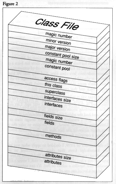 A class file is a little more complicated than you might expect. Figure 2 shows a summary of all the different parts of a class file. There is quite a bit of stuff to keep track of, such as: