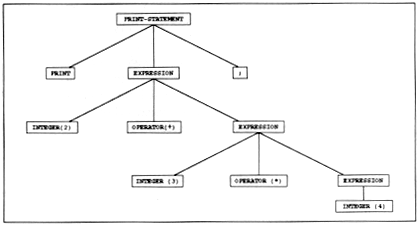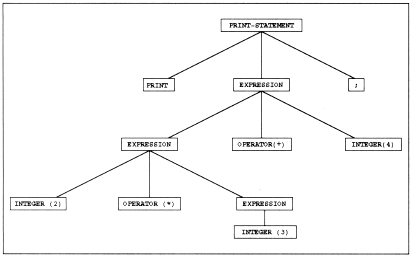 Figure 4 shows the parse tree for print 2 * 3 + 4;. Semantic Analysis. After the parser has had its way with the input, it passes the tree on to other parts of the front end for semantic analysis. Although a parser can handle simple things like operator precedence, the semantic analyzer is needed to interpret more complex aspects of a language, such as whether a value should be interpreted in a scalar or list context.