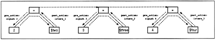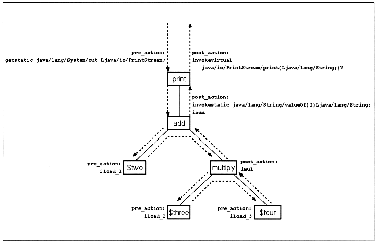 Figure 7 shows how the pre_action and post_action are executed for the remainder of the program. Notice how the print opcode sets up the PrintStream object on the way in, and then expects a value on the stack on the way out as it invokes println(). Here is the output: