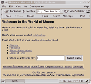 In this case the dhandler will try to retrieve an RSS (Rich Site Summary) file, an XML description that many news sites (including Perl News) use to broadcast their headlines. Looking back at the index.html component shown earlier, you can see that the dhandler parameter resembles a file in the news subdirectory. Selecting the A3 link produces the page seen in Figure 3. This is the kind of magic that makes some coders soil themselves.