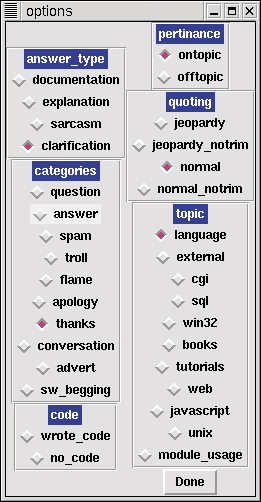 | Figure 2. a Perl/Tk categorization tool for comp.lang.perl.misc |