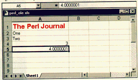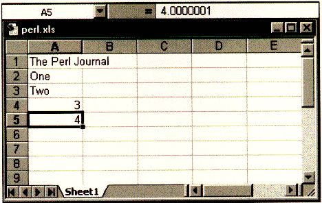 $worksheet->Cells(5,1)->{Value} = 4.0000001;