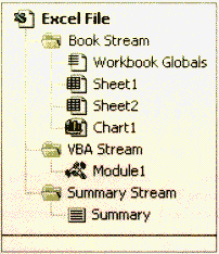 The BIFF data is stored along with other data in an OLE Compound File. This is a structured storage format that acts like a filesystem within a file. A Compound File is composed of storages and streams which, to follow the file system analogy, are like directories and files. This is shown schematically in Figure 3.