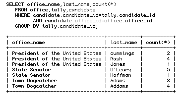 On election night, tallying the vote is simply a matter of issuing a SQL statement to add up each candidate's counts and grouping the results by office. Here's one that will do the trick: