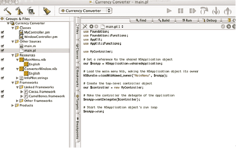 Figure 1: CamelBones integrated into the Cocoa framework. Notice the Frameworks tab, which now includes CamelBones.framework.