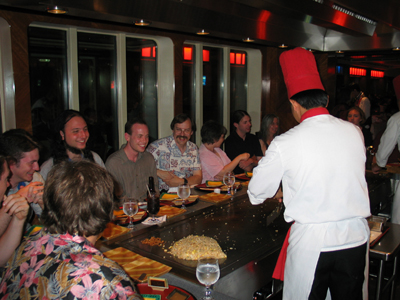 | Perl Whirl-ers at the teppan-yaki grill. From left to right: Mark Bilodeau, Larry Fine, Jeff "japhy" Pinyan, Larry Wall, Gloria Wall, Joshua Hoblitt, and Elyse Grasso. |